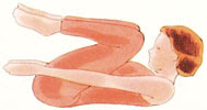 اجلسي مرتاحة متكئة إلى الأمام، مرفقاك فوق ركبتيك، ازفري الهواء ومن ثم :