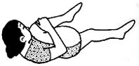 أ) استلقي على الأرض واثني ركبتيك وهما متباعدتان وقربيهما من صدرك . ارفعي ذراعيك بين ركبتيك .
