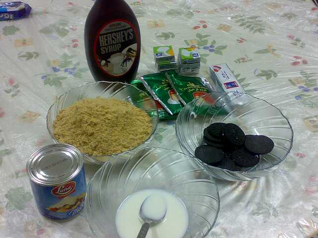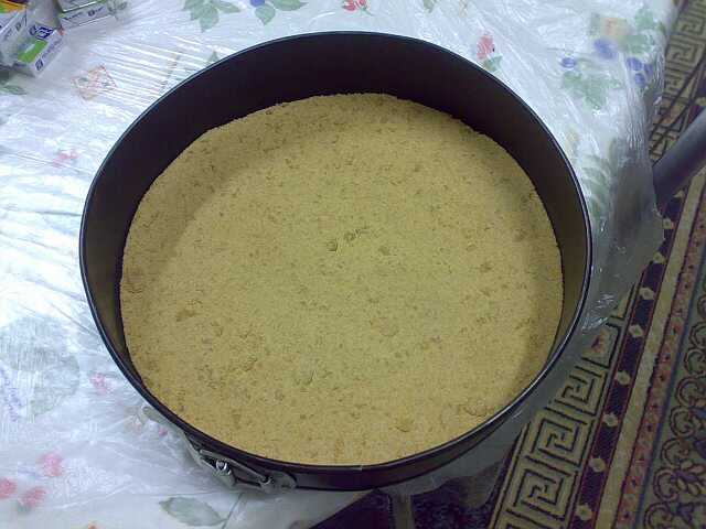 أولا نطحن البسكويت ثم الزبدة والحليب حتى يتجانس الخليط